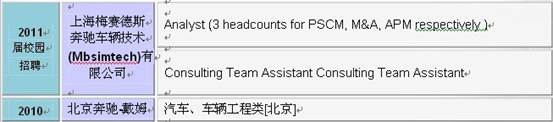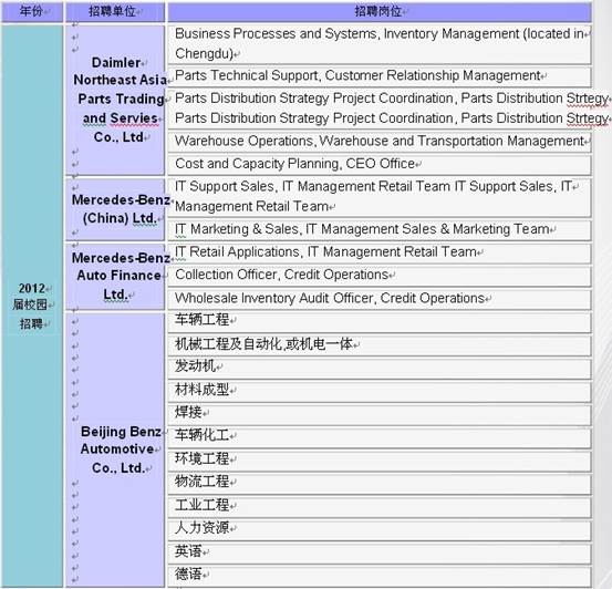 比較 2010、2011、2012三屆校園招聘職位情況可以發(fā)現(xiàn),由于 2011年未進(jìn)行較大規(guī)模的校園招聘,2012屆校園招聘開放可供申請的崗位明顯增多。奔馳每年招聘的所有崗位都招收應(yīng)屆畢業(yè)本科生,同時(shí)對應(yīng)聘者的條件有一定要求。