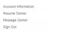 3、登錄賬戶(hù)后,可以看到左邊有幾個(gè)選項(xiàng),點(diǎn)擊進(jìn)入后,分別可以看到你個(gè)人賬戶(hù)的最新消息、你的個(gè)人簡(jiǎn)歷中心、信息中心以及注銷(xiāo)賬戶(hù)出口,如圖一。如想查看個(gè)人簡(jiǎn)歷的職位投遞狀況,可點(diǎn)擊“Resume Center”進(jìn)入查看,頁(yè)面便會(huì)顯示你的個(gè)人簡(jiǎn)歷信息,如圖二。
