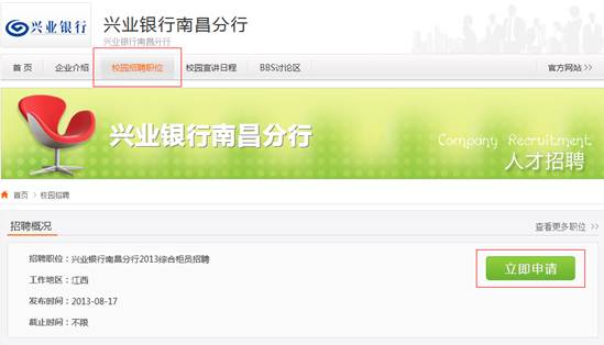 進入某個公司主頁后,點擊“立即申請”即可按照提示進行網(wǎng)申,如圖: