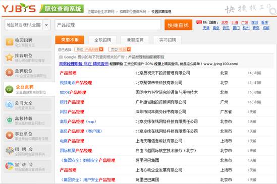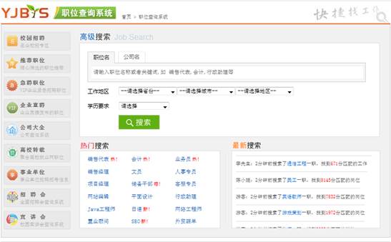 在應(yīng)屆畢業(yè)生職位搜索系統(tǒng)首頁(https://s.yjbys.com/),你還可以享受到更細致的“分類搜索”服務(wù),通過 職位類別、行業(yè)類別、工作地點的篩選,你總可以找到最合適的工作信息。