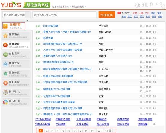 對于應(yīng)屆畢業(yè)生而言,最合適的招聘信息查詢方式是直接點擊“校園招聘”按鈕,逐條查看知名企業(yè)的校園招聘信息,確保不會錯過任何一個知名企業(yè)。