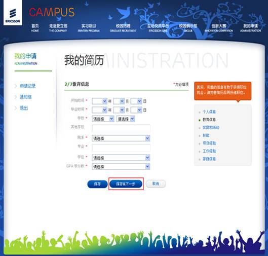 → 填寫教育信息,填寫完畢后點(diǎn)擊“保存& 下一步”繼續(xù)。