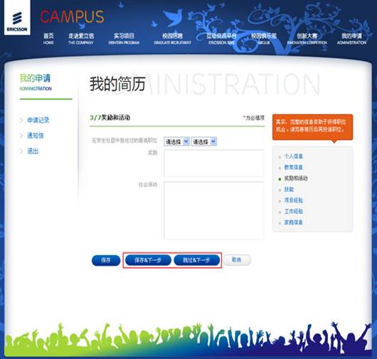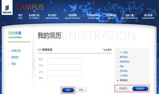 → 點(diǎn)擊頁面左側(cè)的“申請記錄”按鈕,您可以查看申請記錄,修改簡歷,預(yù)覽簡歷,同時(shí)能查看愛立信發(fā)送給您的各種通知信。