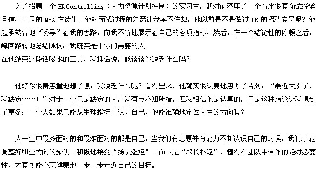 我很喜歡她的熱忱和誠懇的態(tài)度,但是更清楚地感受到了態(tài)度有時不能彌補方法上的缺憾,沒有很好的傾聽習(xí)慣和適度的確認方法,在面試的過程中,很容易失掉不該失去的分數(shù)。