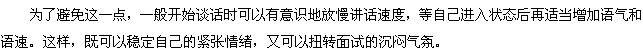 (4) 面試過程中注意控制談話節(jié)奏。進(jìn)入試場致禮落座后,若感到緊張先不要急于講話,而應(yīng)集中精力聽完提問,再從容應(yīng)答。一般來說人們精神緊張的時候講話速度會不自覺地加快,講話速度過快,既不利于對方聽清講話內(nèi)容,又會給人一種慌張的感覺。講話速度過快,還往往容易出錯,甚至張口結(jié)舌,進(jìn)而強化自己的緊張情緒 ,導(dǎo)致思維混亂。當(dāng)然,講話速度過慢,缺乏激情,氣氛沉悶,也會使人生厭。