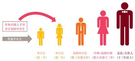 審計(jì)員(Associate,2年)——高級(jí)審計(jì)員(Senior Associate,3年)——經(jīng)理(Manager,3年)——高級(jí)經(jīng)理(Senior Manager,3年)——董事(Director,可選)——合伙人(Partner,終身)