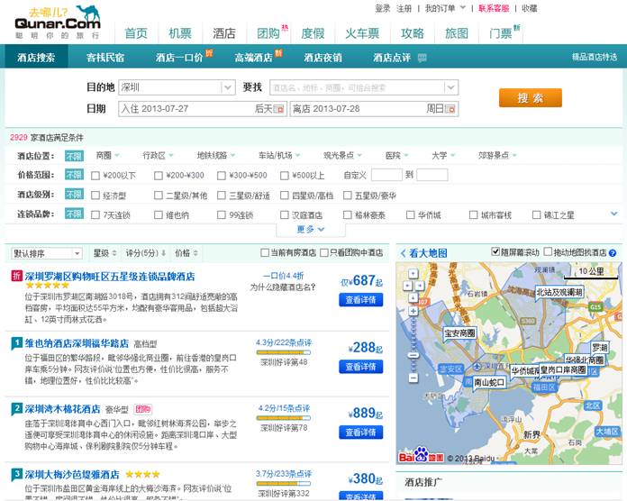 酒店查詢:https://hotel.qunar.com/city/shenzhen/,求職者可以事先查好來到深圳后目的地附近的酒店名稱及所在位置,下車后直奔酒店訂好房間住下。下圖為查詢頁面,供求職者參考。