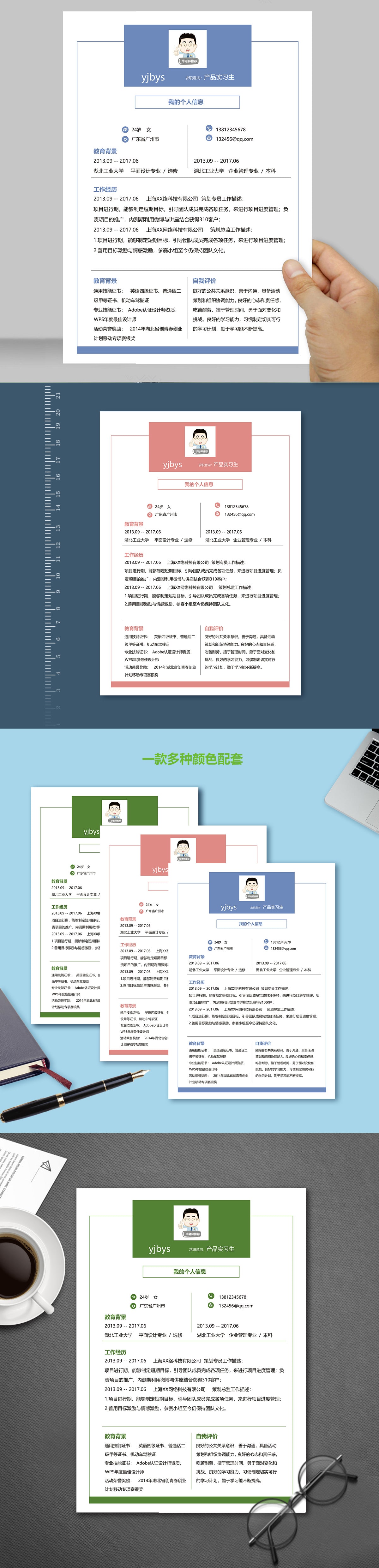 A588常用簡(jiǎn)歷模板藍(lán)色,粉色,綠色